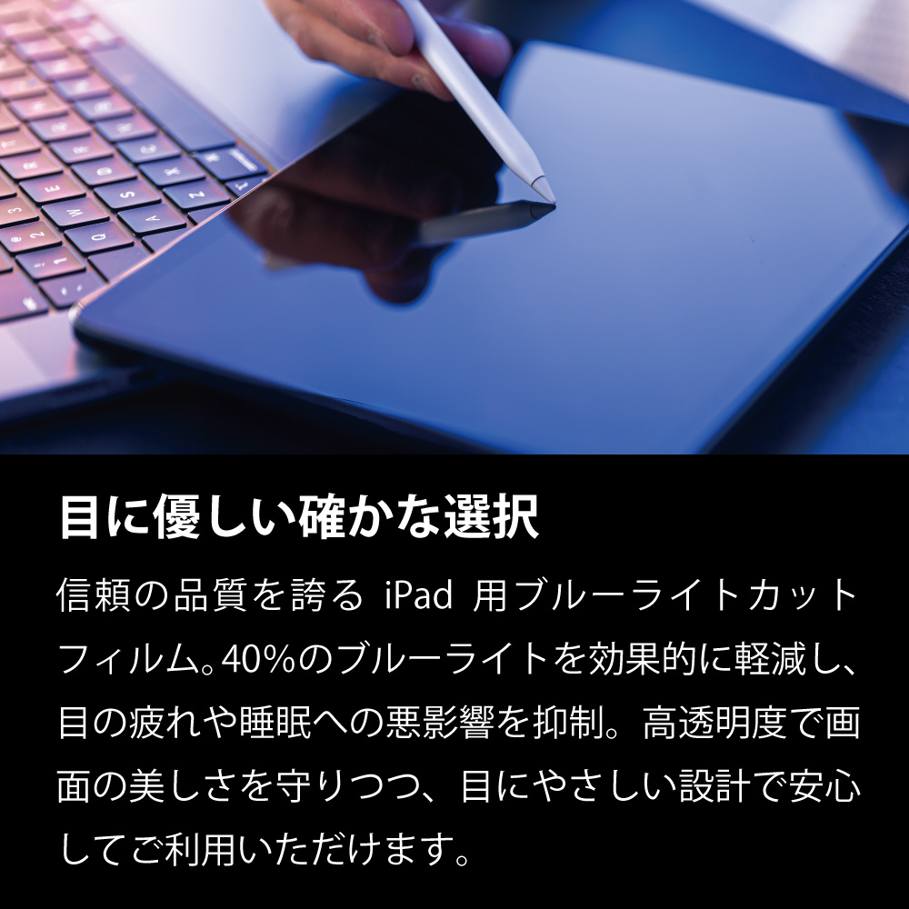 iPad用ブルーライトカットフィルム。40%のブルーライトを効果的に軽減し、目の疲れや睡眠への悪影響を抑制。高透明度で画面の美しさを守りつつ、目に優しい設計で安心して使えます。