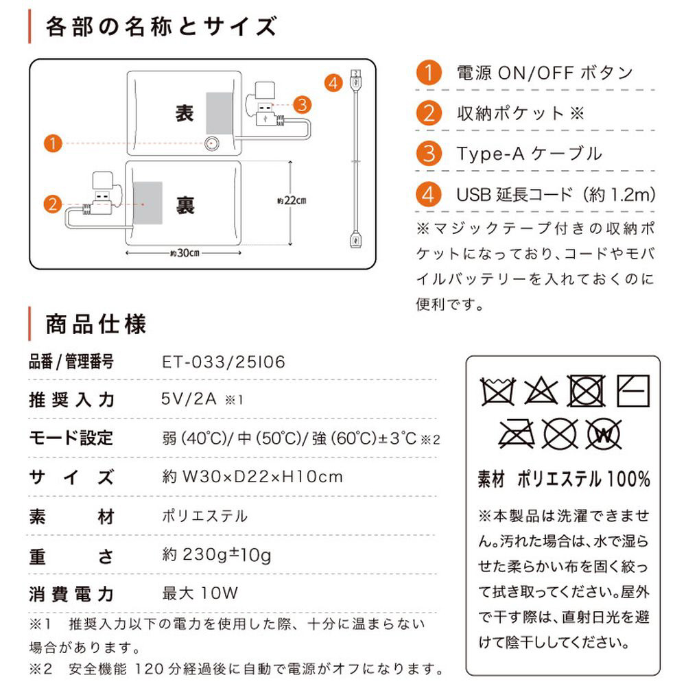 | 仕様1 | ■推奨入力:5V/2A ■モード設定:弱(40℃)/中(50℃)/強(60℃)±3℃ ■サイズ:約W30×D22×H10cm ■素材:ポリエステル ■重さ:約230g±10g ■消費電力:最大10W |
