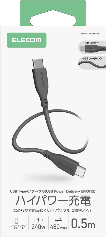 やわらかくなめらかな手触りのシリコン素材を採用した、取り回しやすいUSB Type-C(TM)ケーブルです。最大240Wのハイパワー充電に対応し、スマートフォンやノートパソコンなどさまざまな機器の充電と、最大480Mbpsでのデータ転送が可能です。