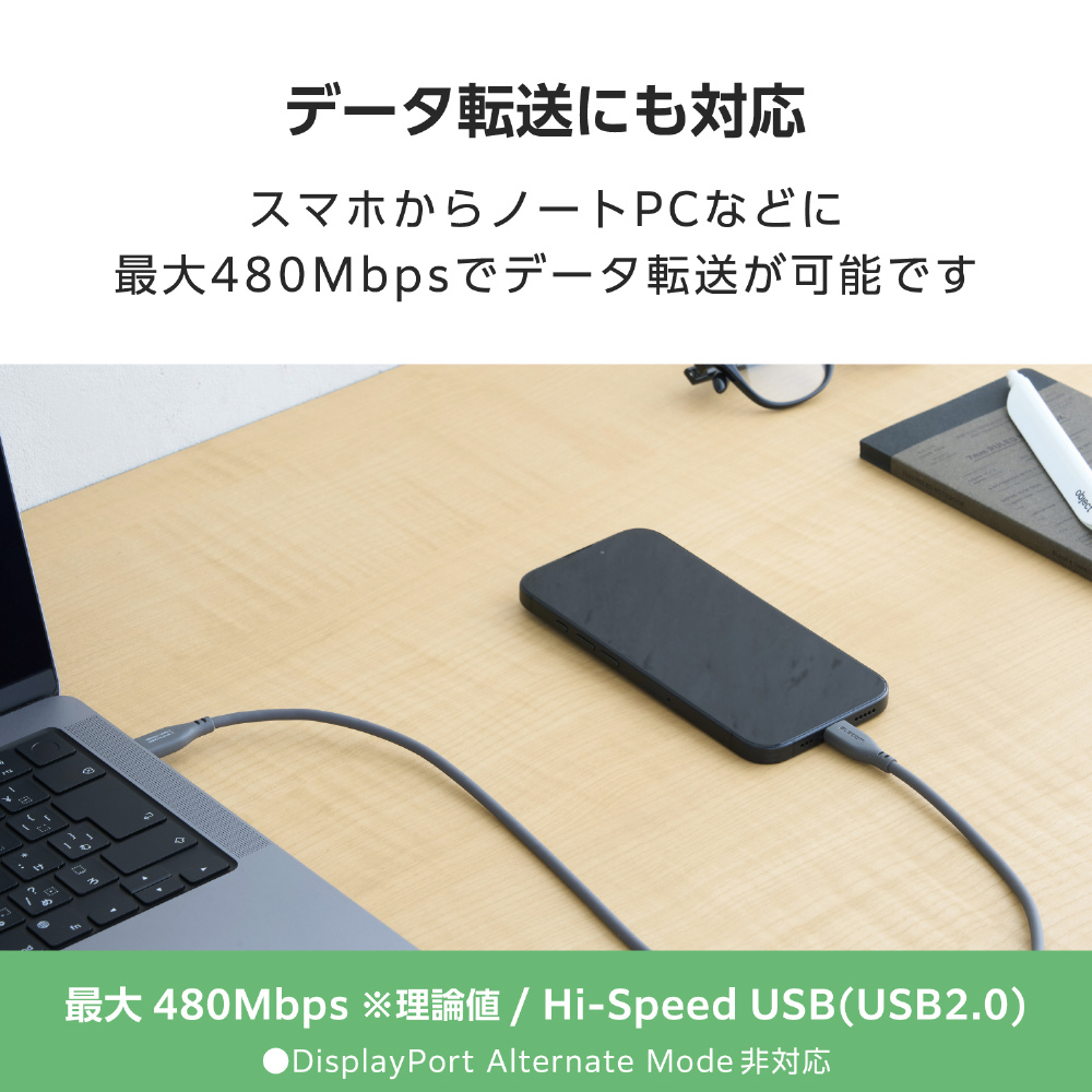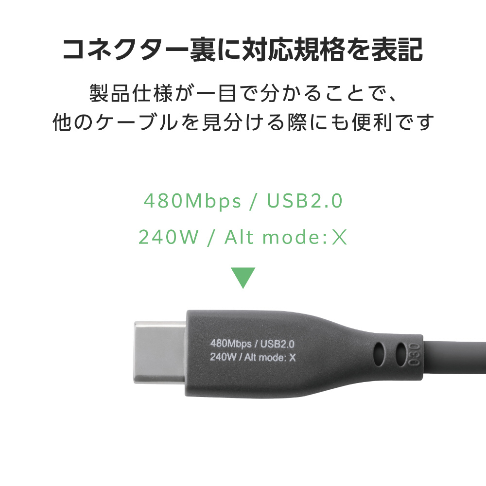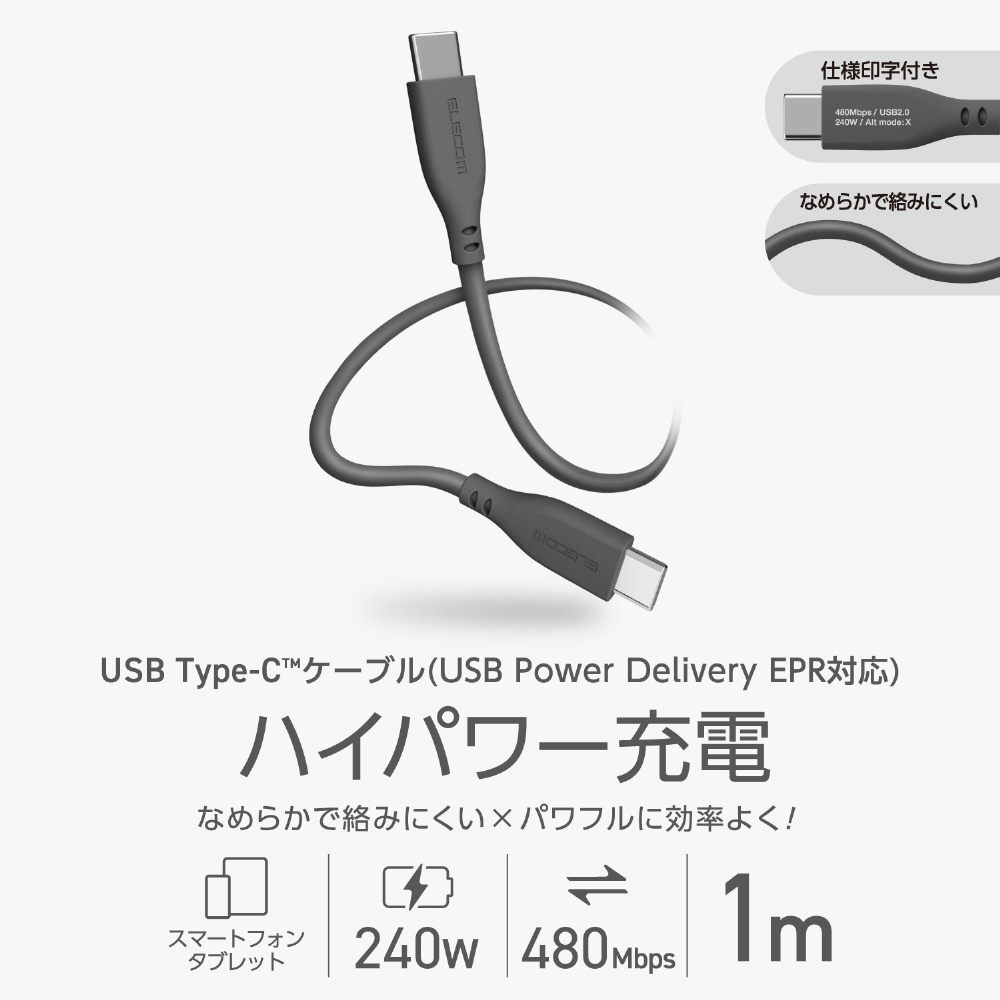 やわらかくなめらかな手触りのシリコン素材を採用した、取り回しやすいUSB Type-C(TM)ケーブルです。最大240Wのハイパワー充電に対応し、スマートフォンやノートパソコンなどさまざまな機器の充電と、最大480Mbpsでのデータ転送が可能です。