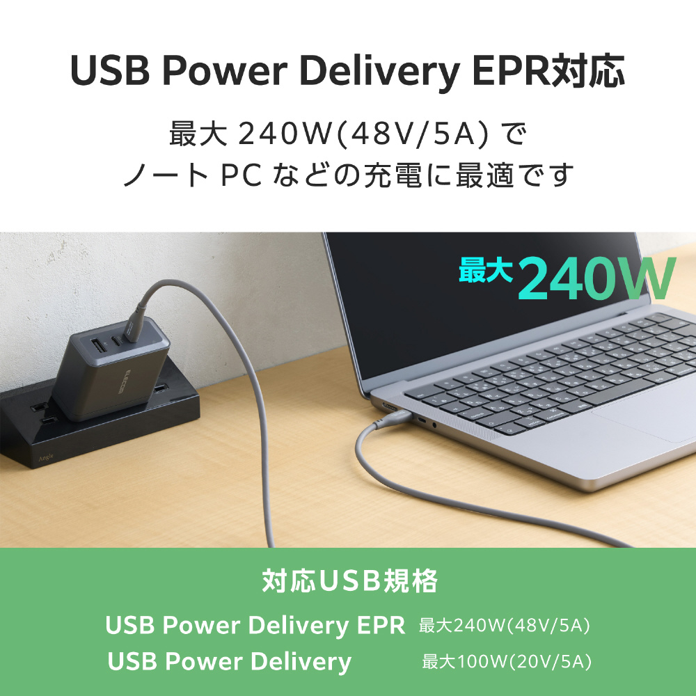 USB Power Delivery EPR対応により、最大240W(48V/5A)の電力で接続機器への充電が可能です。ハイスペックパソコンをはじめ、高出力を必要とする機器を充電する際も安心です。また、従来のUSB Power Delivery 最大100W(20V/5A)にも対応しています。