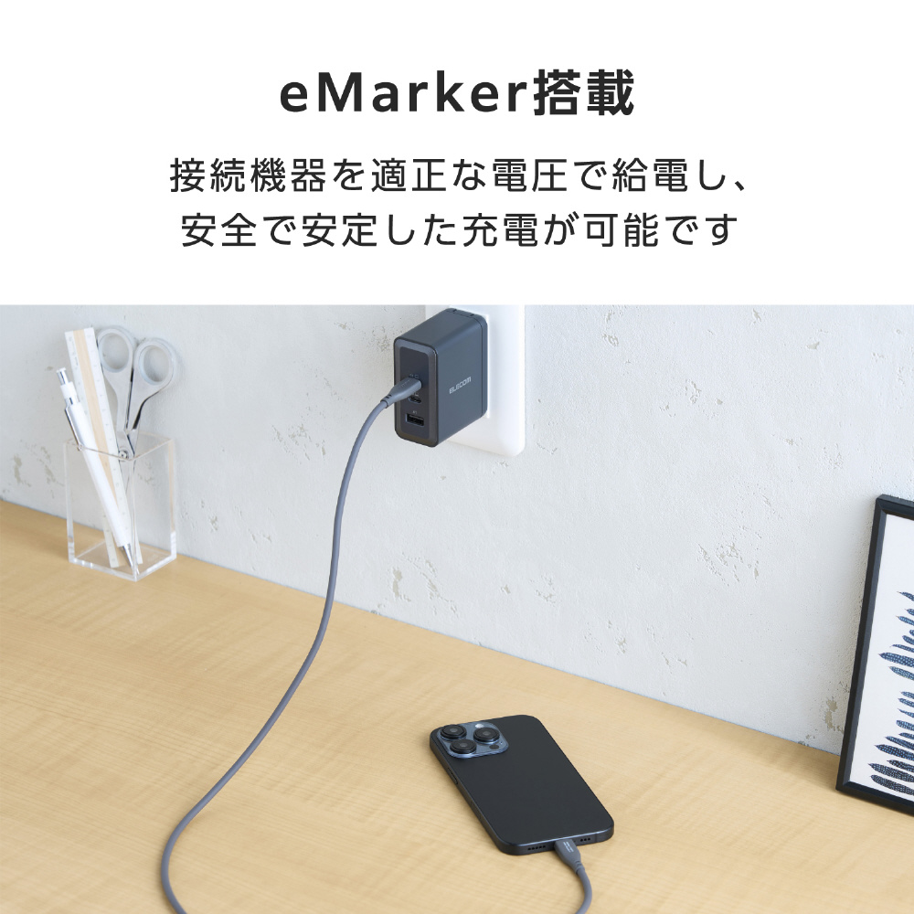 eMarkerを搭載し、充電時に接続する機器へ供給する電圧を自動で調整します。適正な電圧で給電できるため、安定した充電が可能です。