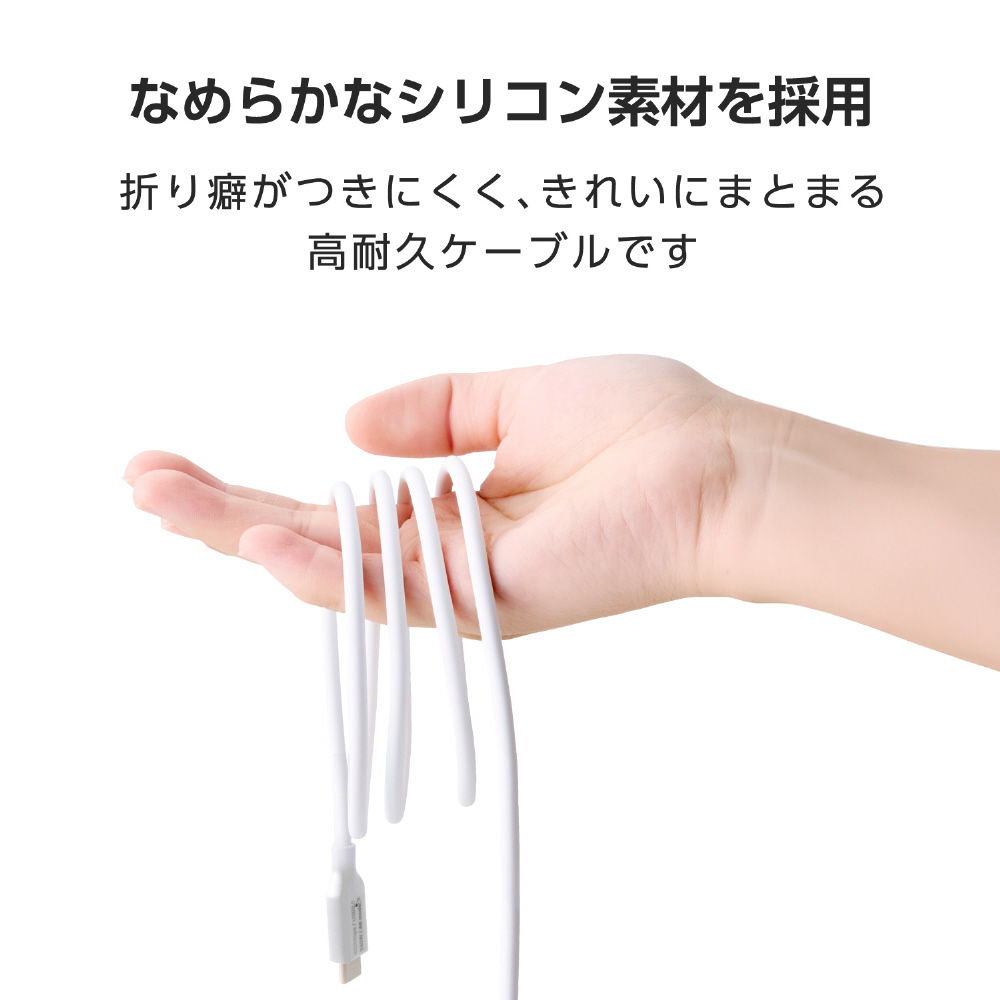 ケーブル外皮には、やわらかくなめらかな手触りのシリコン素材を採用しています。折り癖がつきにくく、高い耐久性を兼ね備えており、束ねても絡みにくく、取り回しやすいです。