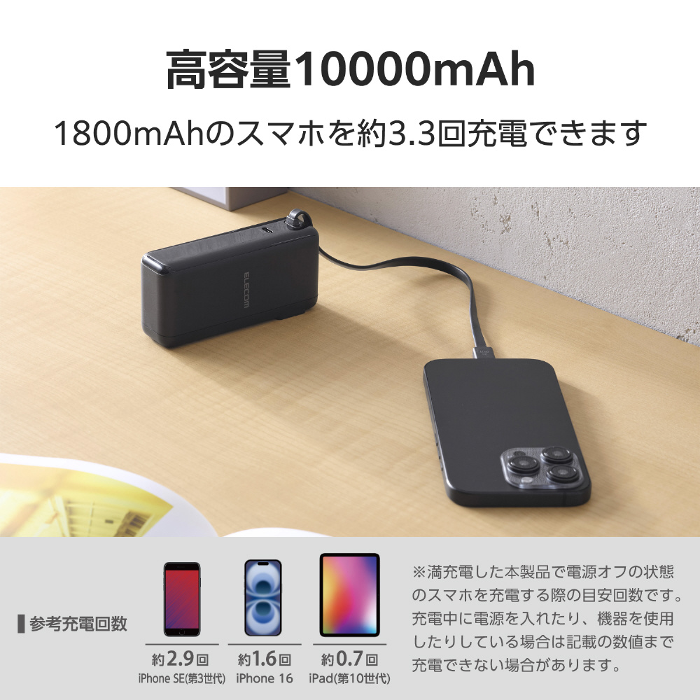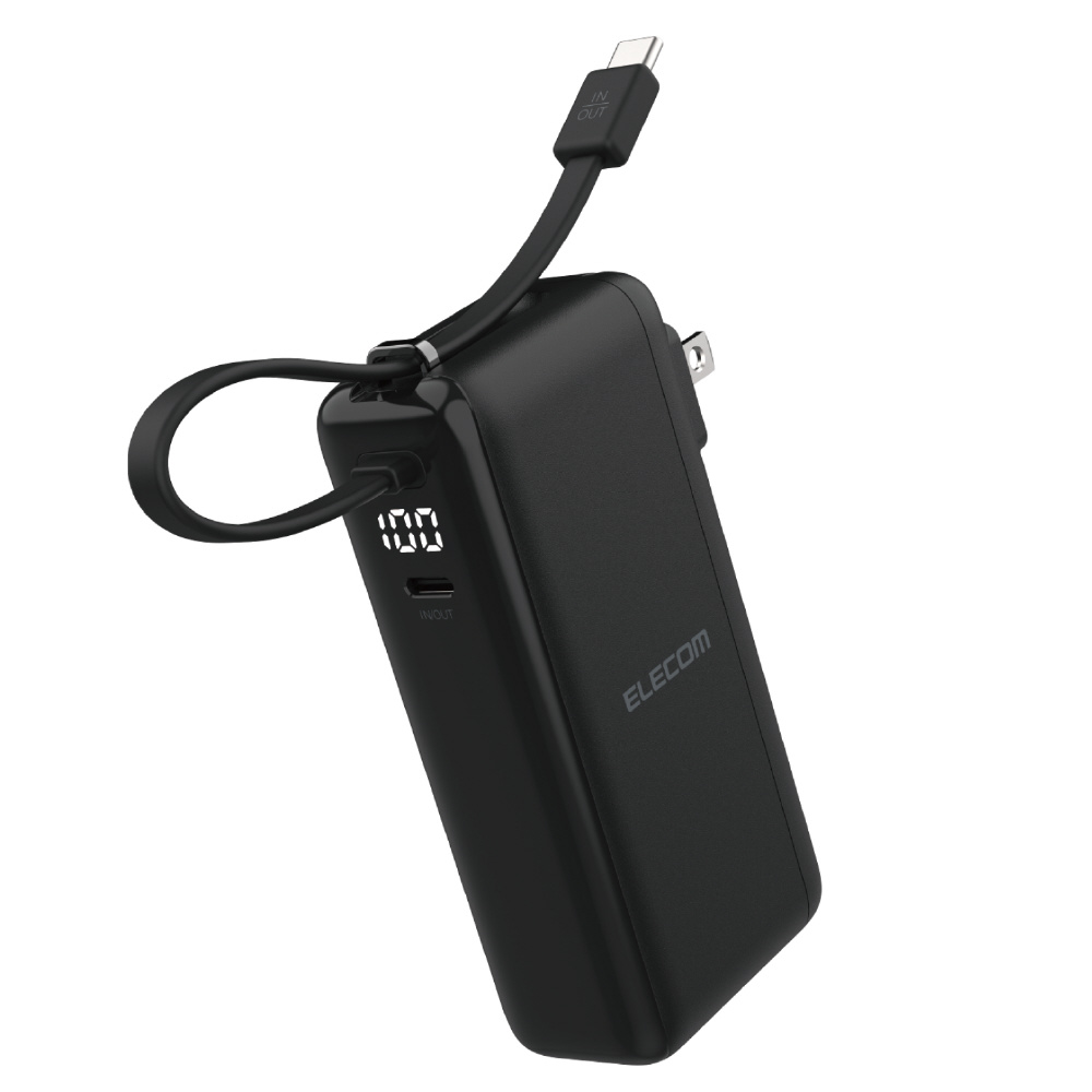 AC充電器としても使える2in1タイプのモバイルバッテリーです。10000mAhの大容量にUSB Type-C(TM)ケーブルが一体化されているため、外出先でも安心して充電できます。バッテリー残量はLEDパネルで1%単位で確認できます。USB Power Delivery対応です。