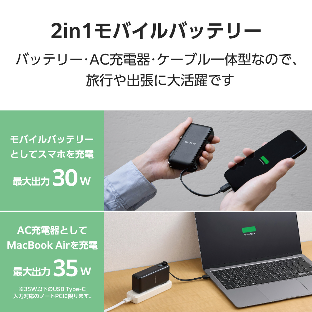 ※USB Type-Cポートまたは一体型USB Type-Cケーブルを単独で使用した場合、AC充電器として使用時PD最大35W/PPS最大30W、モバイルバッテリーとして使用時PD最大30W/PPS最大30Wとなります。