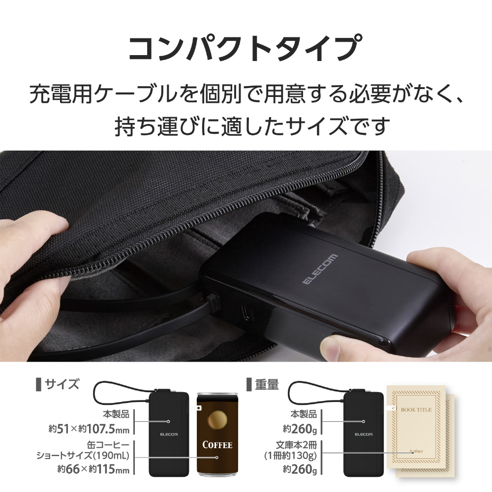 AC充電器と、USB Type-C(TM)ケーブルを一体化したモバイルバッテリーです。USB Power Delivery対応です。