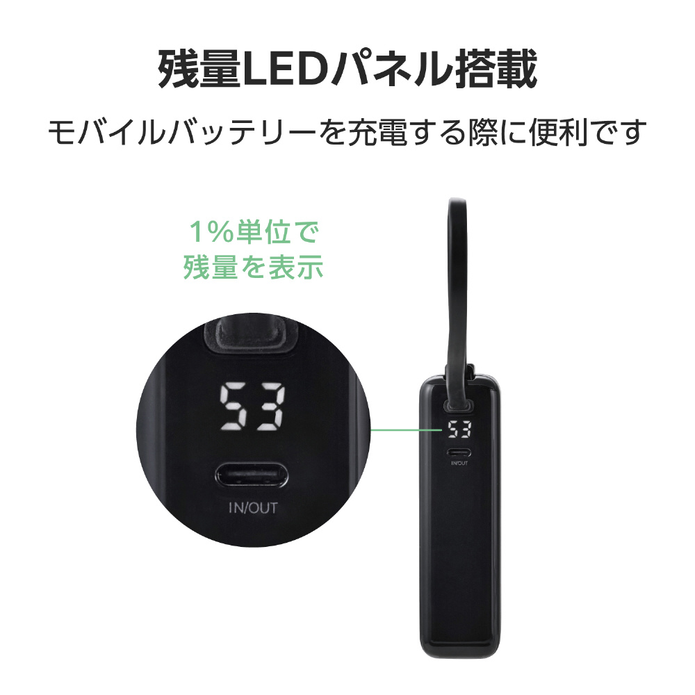 LEDパネルでバッテリー残量を1%単位で確認しながら使えます。事前にモバイルバッテリーを充電する際などに便利です。