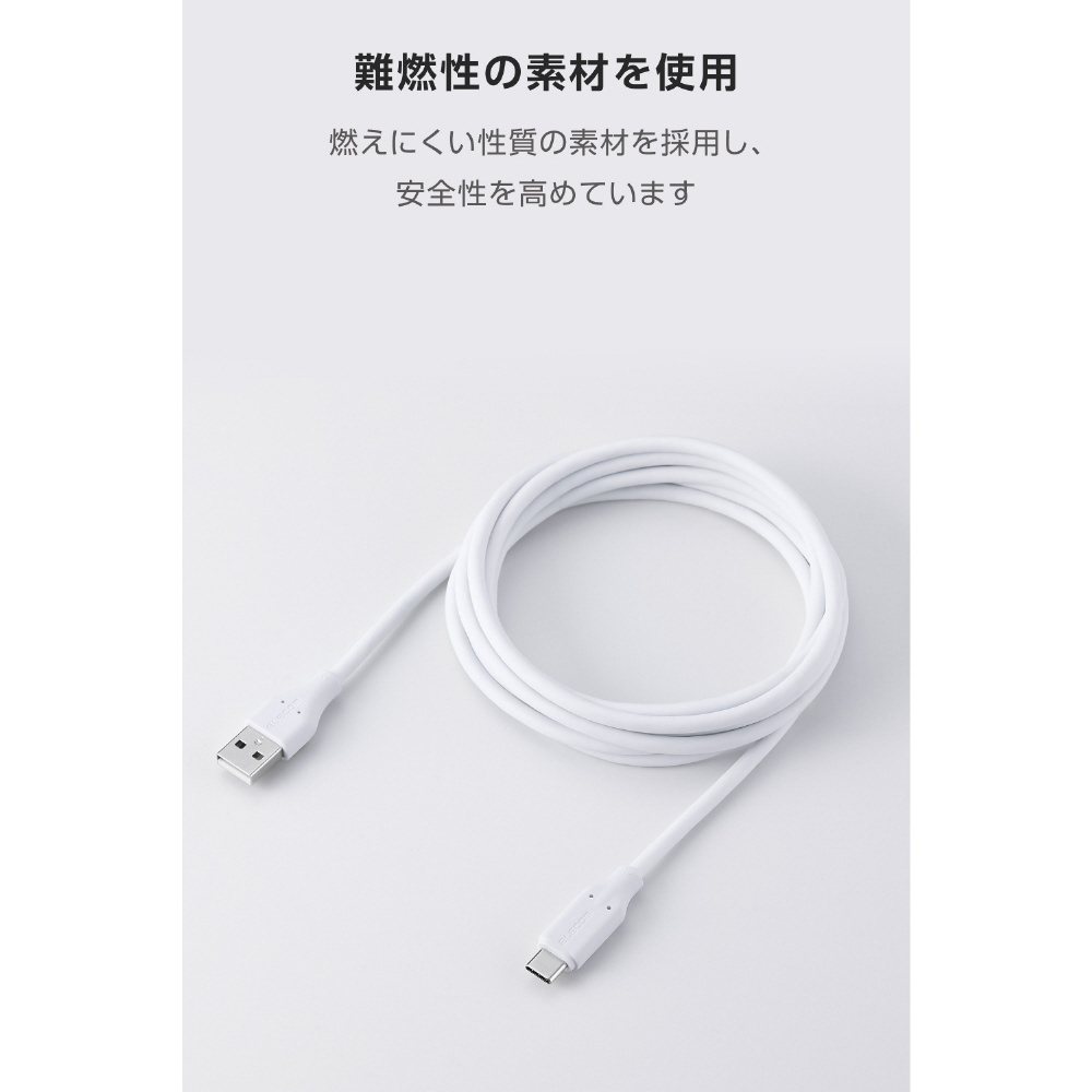 安心と使いやすさを両立!異物の挟み込みや水濡れなどの意図しない接続によるショートや発熱・発火を検知し、自動で電流を遮断するブレーカーを搭載したUSBケーブルです。なめらかな手触りで、やわらかく扱いやすいシリコン素材を採用しています。USB-Aポート搭載のパソコンやAC充電器と、USB Type-C(TM)ポート搭載のスマートフォンなどを接続して、充電やデータ転送ができます。