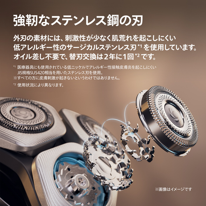 薄くなった外刃*と、スーパーリフト&カットテクノロジーにより、やさしく、しっかり深剃り。1枚目のリフト刃がヒゲを引き上げ、2枚目のカット刃が深剃りカット。毎分150,000回カットする72枚の回転刃は色々な方向に生えているヒゲを効率的に取り込み、しっかり深剃りします。