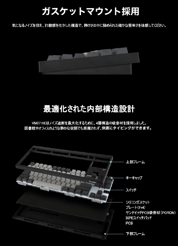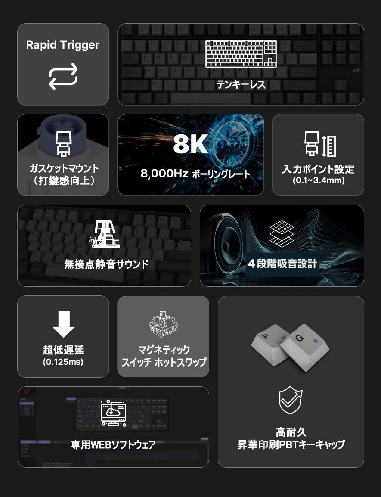 8kHzポーリングレート、入力遅延0.125msのハイパフォーマンスに対応。また、打鍵感を向上させるためにガスケットマウント方式を採用しています。マグネティックスイッチでありながら静電容量無接点方式のような静かで柔らかい打鍵感を実現した「無接点マグネティックスイッチ」を採用しています。