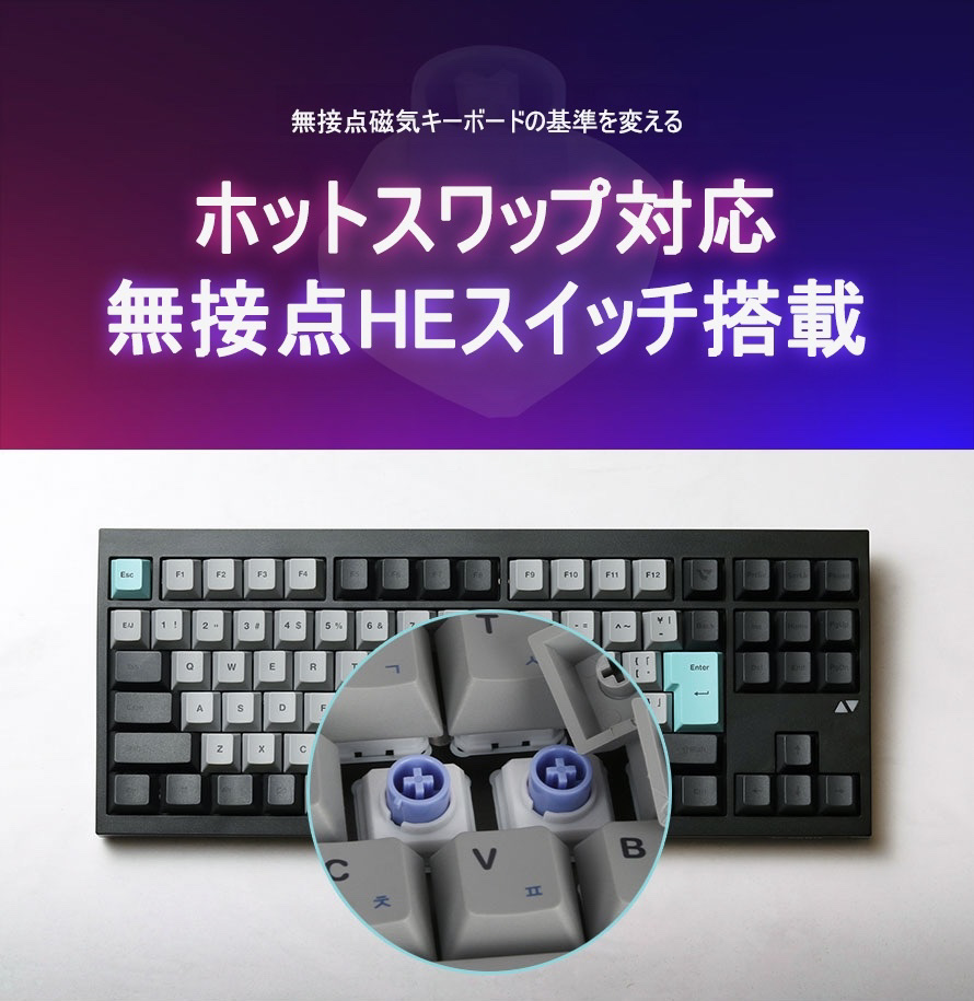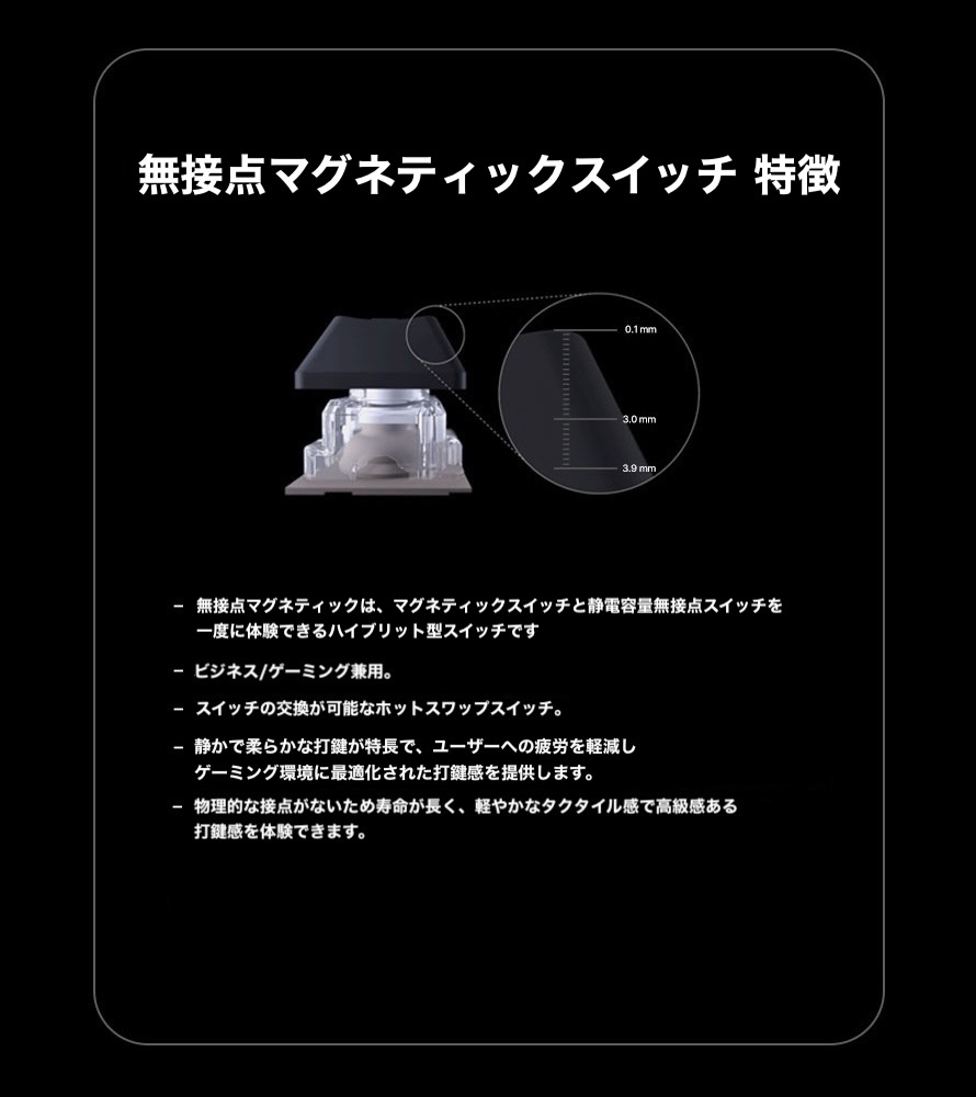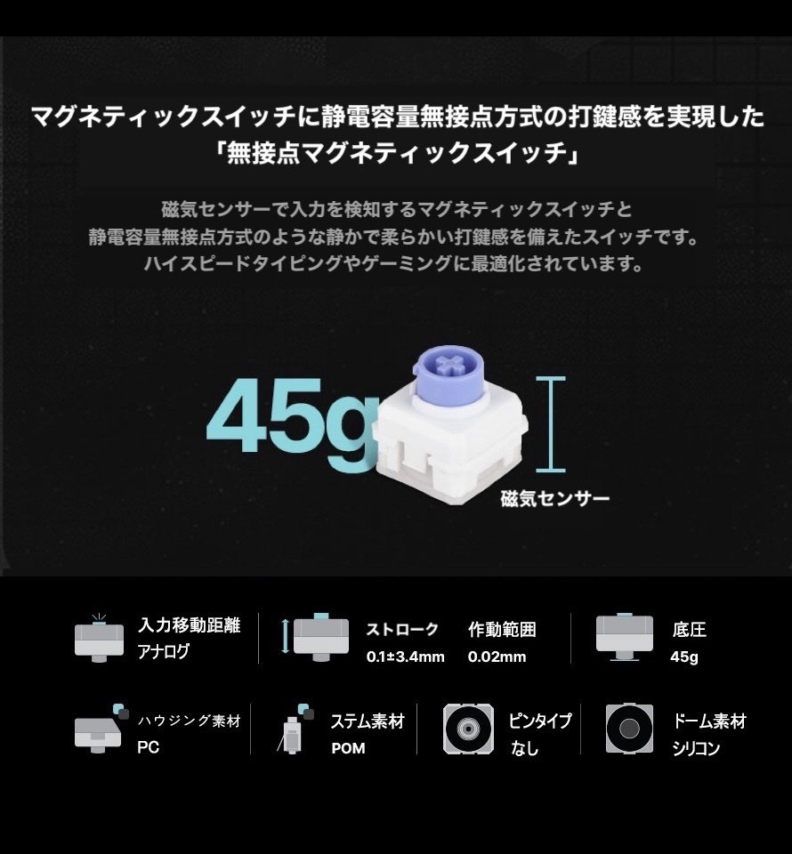 マグネティックスイッチに静電容量無接点方式のような打鍵感を実現した「無接点マグネティックスイッチ」を採用。磁気センサーで入力を検知するマグネティックスイッチと静電容量無接点方式のような静かで柔らかい打鍵感を備えたスイッチです。ハイスピードタイピングやゲーミングに最適化されています。