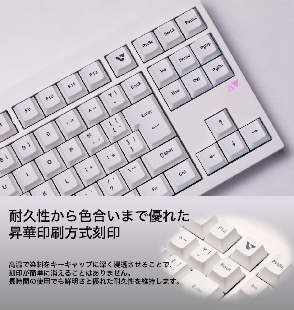 PBT素材・昇華印刷を採用したキーキャップは、汚れにくく長期間使用しても印字が消えにくい、非常に優れた耐久性と快適な打鍵感が特長です。