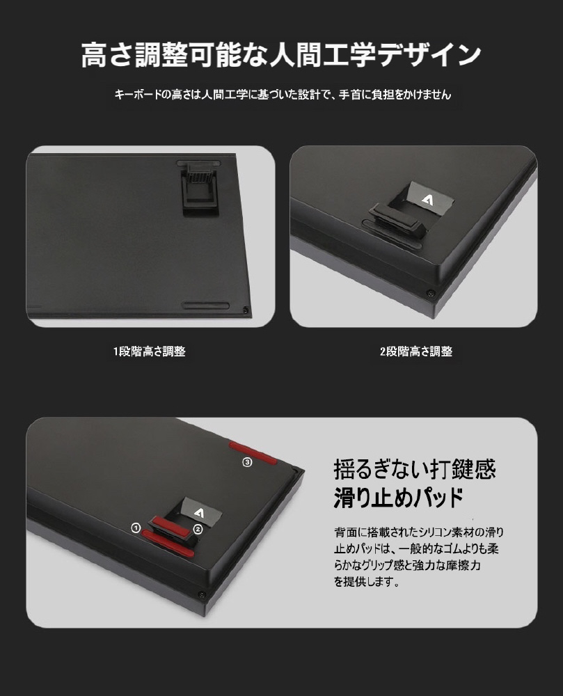 本体裏のスタンドを広げると2段階の高さ調節ができます。人間工学に基づいた設計で、手首への負担を軽減します。またキープロファイルは使用者が最も楽な姿勢で操作できるようにCHERRYプロファイルを採用しています。