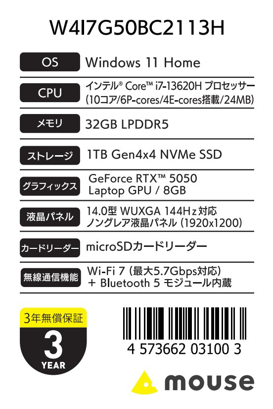 W4I7G50BC2113H ゲーミングノートパソコン G TUNE 14(RTX 5050) ブラック [14.0型 /Windows11 Home /intel Core i7 /メモリ:32GB /SSD:1TB /日本語版キーボード]