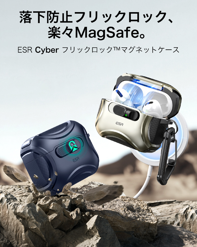 磁気吸着式の蓋とMagSafe対応の充電が可能な超タフなスライド開閉式 AirPods Proケースです。