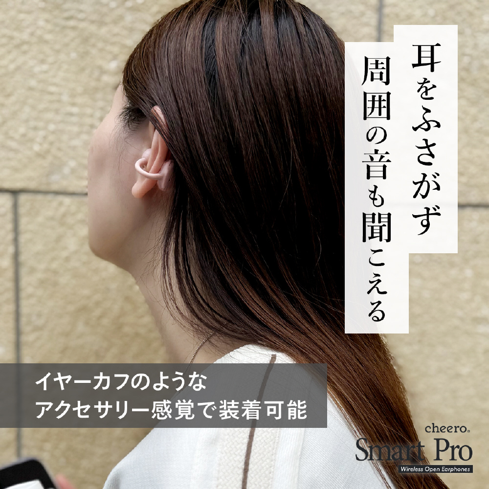 イヤーカフのように装着できるオープン型ワイヤレスイヤホン。圧迫感がなく、長時間の使用でも快適です。