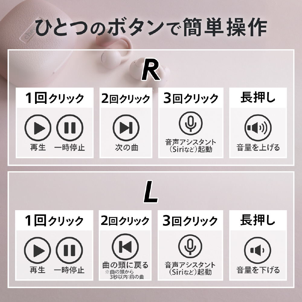 操作ボタンに意図せず触れてしまっても誤操作が起きないよう、タッチセンサー式ではなく物理ボタンを採用。音楽や通話をストレスなく楽しめます。