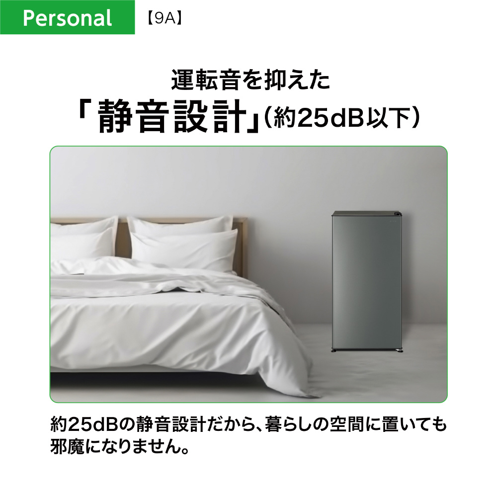 | 商品名 | 90L1ドア冷蔵庫 ダークシルバー AQR-9A(DS) [45.2cm /90L /1ドア /右開きタイプ /2025年] |