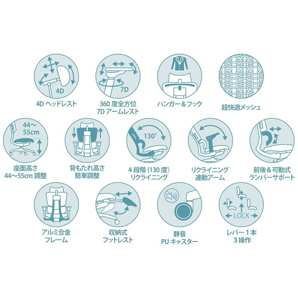 | 仕様3 | [素材] 張地:プレミアムフィットメッシュ フレーム:ポリマーナイロン+ガラス繊維+ポリプロピレン+アルミ合金 アームレスト:ポリマーナイロン+ガラス繊維 ハンガー:ポリマーナイロン+ガラス繊維 脚:アルミ合金 キャスター:ポリマーナイロン+PU(ポリウレタン)CFCsなし シリンダー:4級クラス |