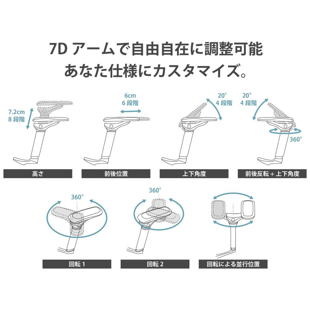 「もっと自由に動かせたら」というお声から、アームレストを大幅に進化。3D、4Dが“一般的”の時代から、さらに4方向進化した、自社史上初の7Dへ。本体だけでなく、パッド単体も360度回転し、アーム自体が跳ね上がるのであらゆる角度に対応します。