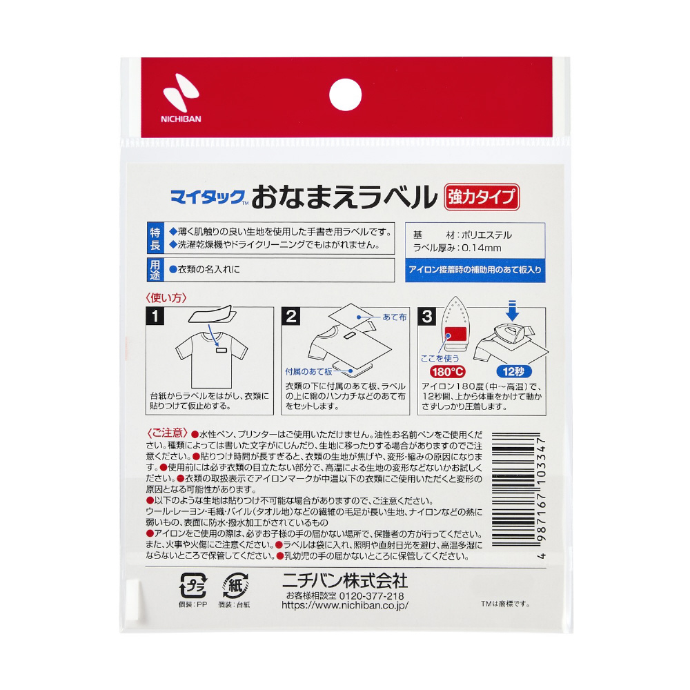 衣類などの布地にアイロンを使って接着することができるラベルです。接着後のラベルは約150回の洗濯・乾燥やドライクリーニングに耐えることができます。業務用の乾燥にも対応いたします。お子様の入園入学時や、介護施設に衣類を持ち込む時など衣類への名入れが必要な場合に便利です。