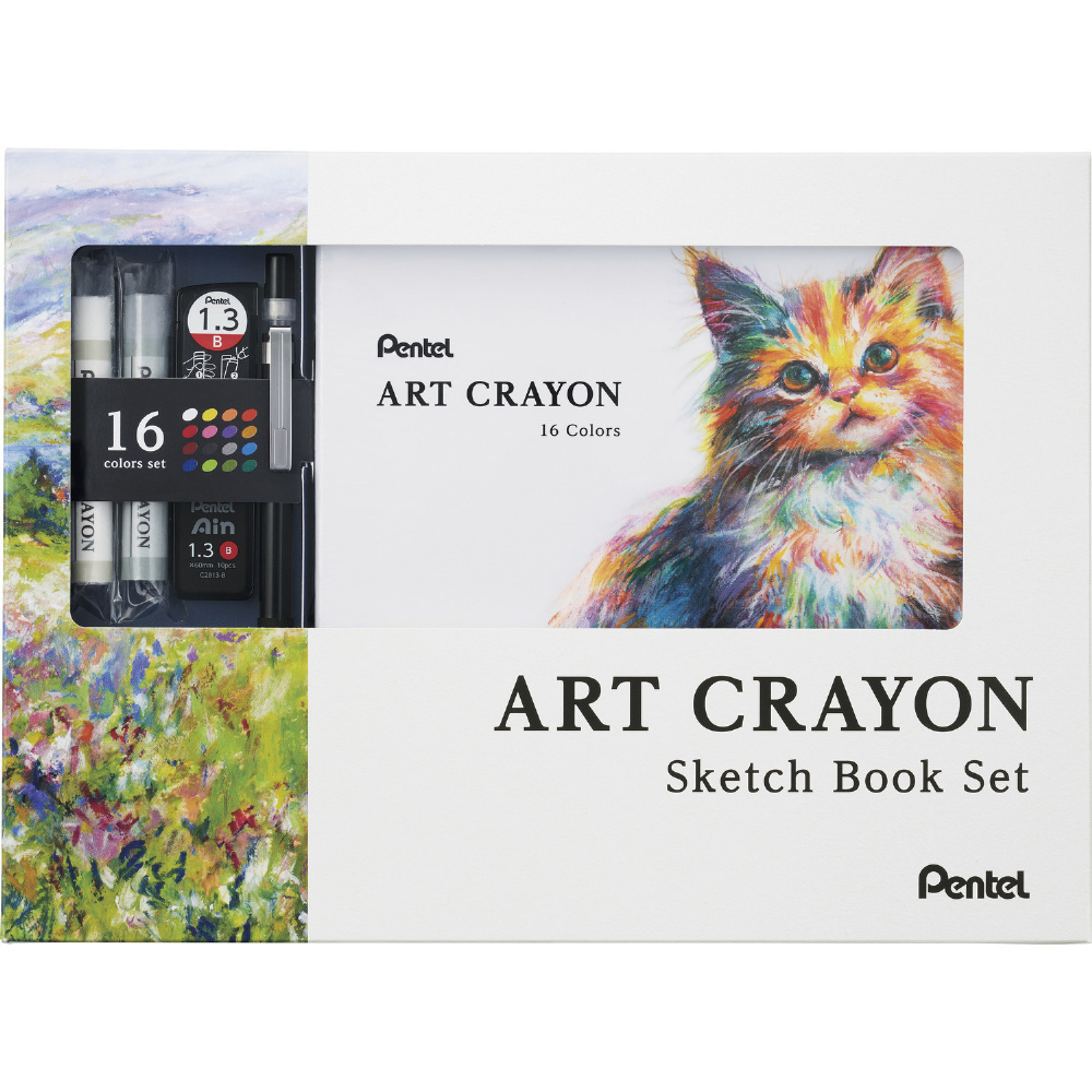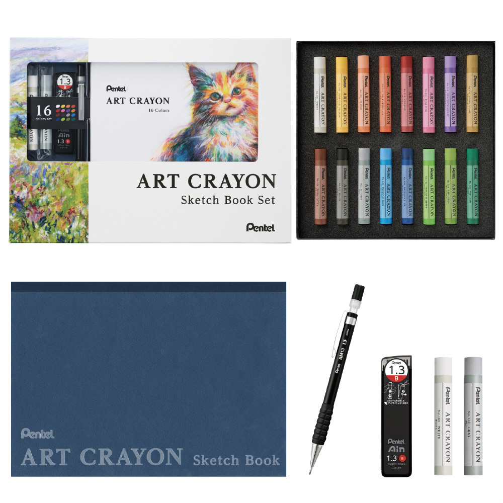 この度、アートクレヨンの手軽さをより体感できるスケッチブックセットを限定発売!下絵を描くのに最適な1.3mmの”AMAINシャープペン”と”Pentel Ain替芯”も入っているので、これさえあれば表現を楽しむ環境が整えられます。