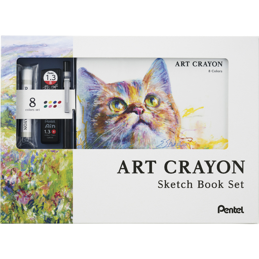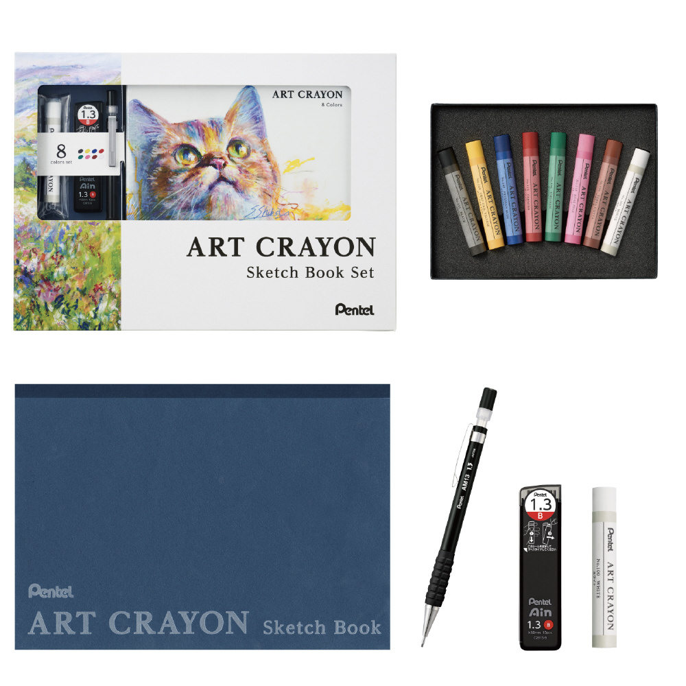 この度、アートクレヨンの手軽さをより体感できるスケッチブックセットを限定発売!下絵を描くのに最適な1.3mmの”AMAINシャープペン”と”Pentel Ain替芯”も入っているので、これさえあれば表現を楽しむ環境が整えられます。