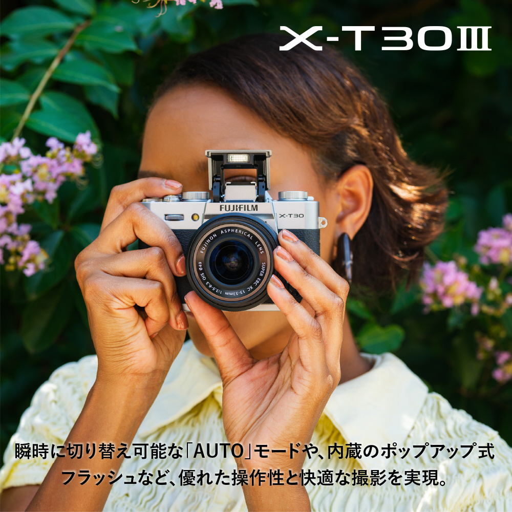 従来モデル「FUJIFILM X-T30 II」と同じ質量378g※1の小型軽量ボディとクラシカルなセンターファインダースタイルのデザインを踏襲し、裏面照射型約2610万画素「X-Trans CMOS 4」※2センサーと、高速画像処理エンジン「X-Processor 5」を搭載したミラーレスデジタルカメラ。