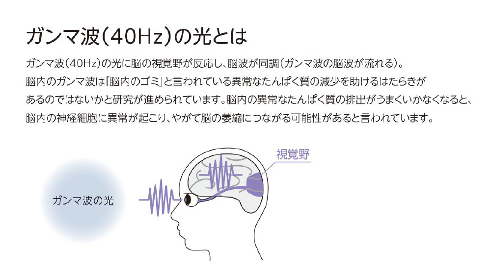 ガンマ波(40Hz)の光に脳の視覚野が反応し、脳波が同調(ガンマ波の脳波が流れる)。脳内のガンマ波は脳内のゴミと言われる異常なたんぱく質の減少を助ける働きがあるのではないかと研究が進められています。脳内の異常なたんぱく質の排出がうまくいかなくなると、脳内の神経細胞に異常が起こり、やがて脳の萎縮につながる可能性があると言われています。