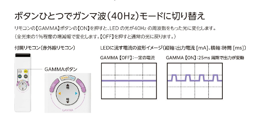 リモコンのGAMMAボタンのONを押すと。LEDの光が40Hzの周波数をもった光に変化します。(全光束の1%程度の増減幅で変化します。OFFを押すと通常の光に戻ります)