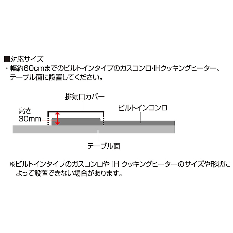 ビルドインタイプのガスコンロやIHクッキングヒーターのサイズや形状によっては設置できない場合があります。
