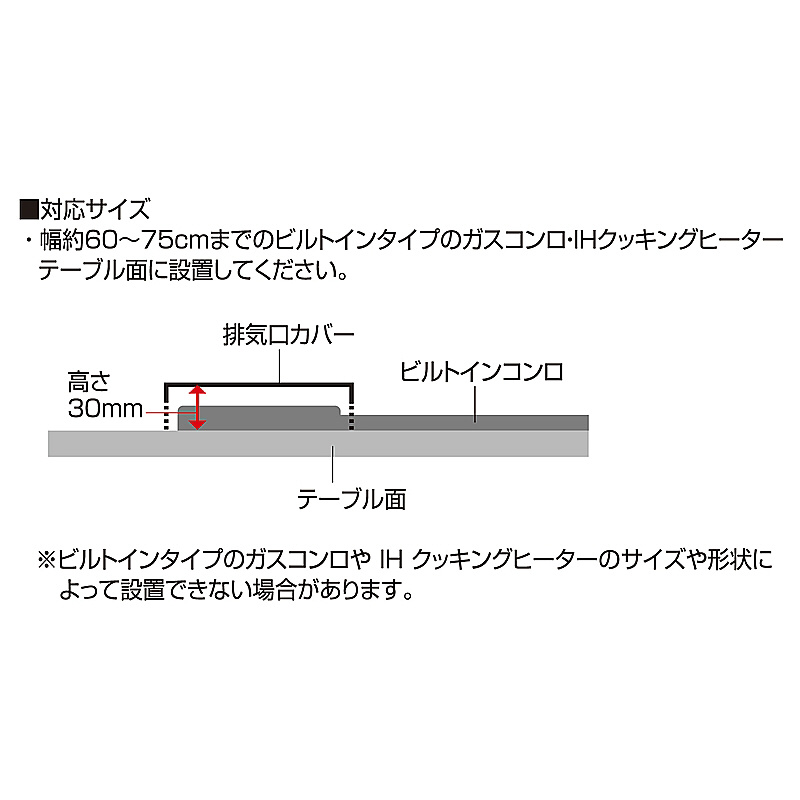 排気口に置くだけで、汚れやゴミが入るのを防ぎます。奥行がワイドサイズで鍋やケトルの一時置きにも使えます。ワイドタイプのコンロにも使えます。丸洗いできてお手入れ簡単。ビルドインタイプのガスコンロ・IHクッキングヒーター専用です。据え置きタイプのガスコンロ・IHクッキングヒーターには使用できません。ビルドインタイプのガスコンロやIHクッキングヒーターのサイズや形状によっては設置できない場合があります。耐荷重(5kg)以内で使用してください。幅は約44cm~80cmに調整できます。引き出し最大線以内で使用してください。グリル使用時は、必ず本品が排気口に掛からないように移動させて使用してください。つけ置き洗いはしないでください。錆等の原因になります。アルミや鉄等異種金属と接触したまま放置しないでください。錆の原因になります。