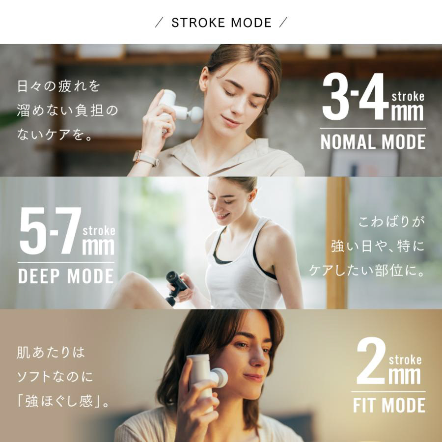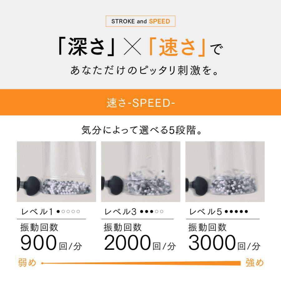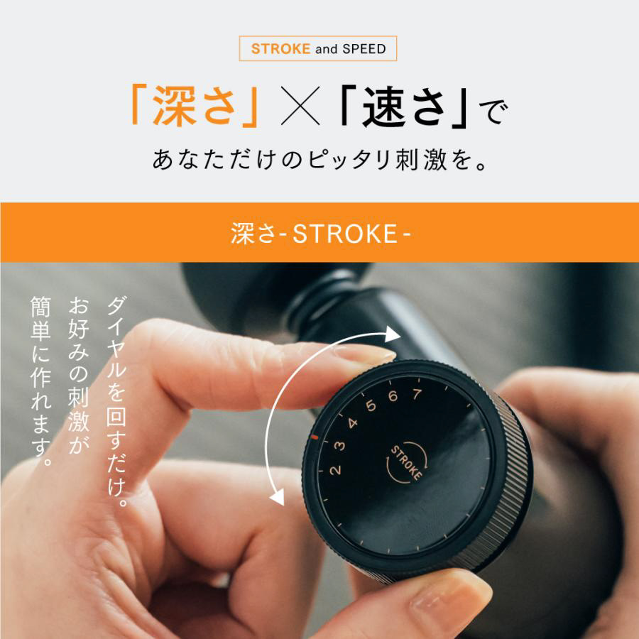 従来では速さ(振動スピード)調節のみだったハンディガンに【手圧変動テクノロジー】が加わり、新しく深さ(ストローク)の調整が可能に。