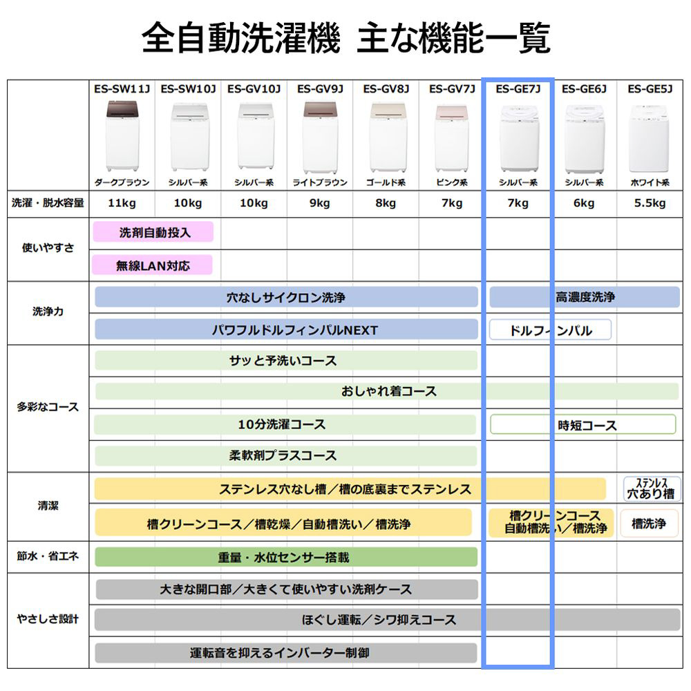 全自動洗濯機 シルバー系 ES-GE7J-S [洗濯7.0kg /簡易乾燥(送風機能) /上開き]【生産完了品】