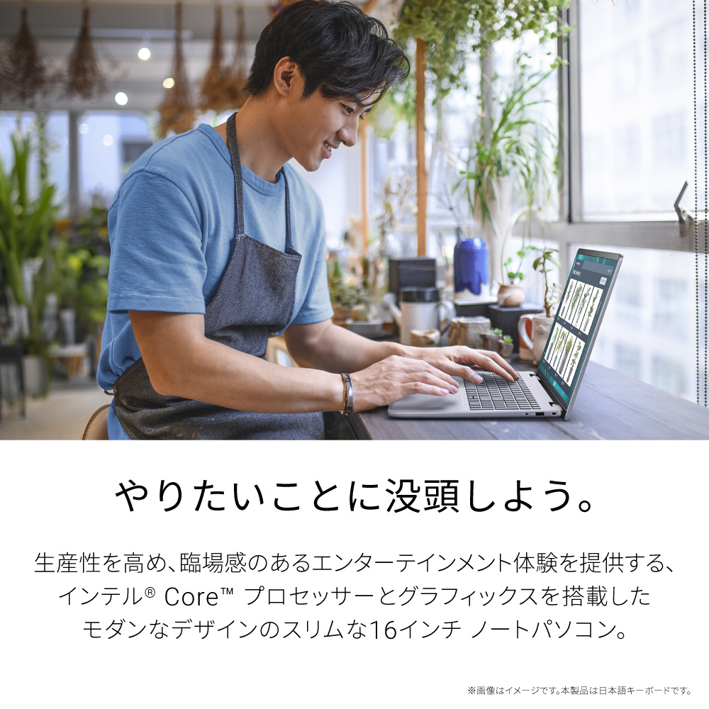 やりたいことに没頭しよう。生産性を高め、臨場感のあるエンターテインメント体験を提供する、インテル Core プロセッサーとグラフィックスを搭載したモダンなデザインのスリムな16インチ ノートパソコン。