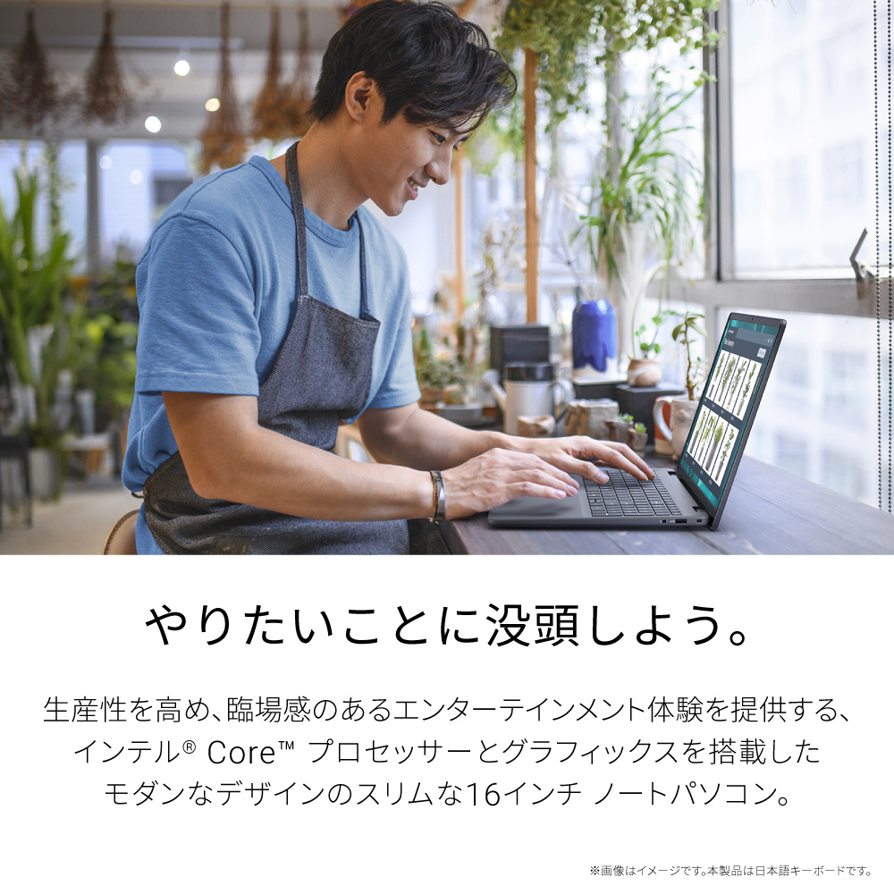 やりたいことに没頭しよう。生産性を高め、臨場感のあるエンターテインメント体験を提供する、インテル Core プロセッサーとグラフィックスを搭載したモダンなデザインのスリムな16インチ ノートパソコン。