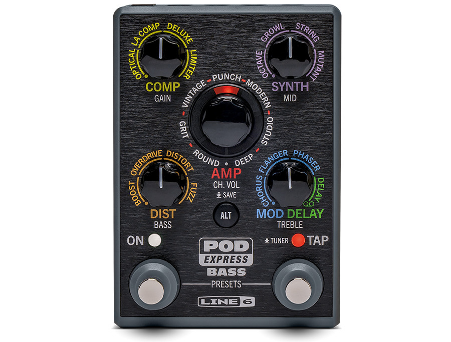 POD Express Bassのインターフェースは非常にシンプルです。中央のエンコーダーでアンプを選択し、エフェクトは対応するノブを回すだけで使用できます。中央のノブの周りには7つのセグメントに分割されたマルチカラーLEDが点灯し、さまざまなパラメーター機能のステータスを確認できます。