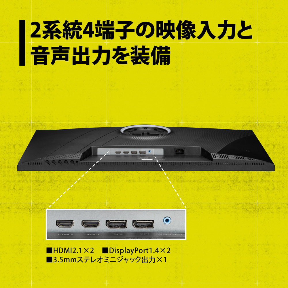 DisplayPort x2、HDMI x2の映像入力端子、オーディオ出力 x1の音声用端子を備えているため、複数のPCやゲーム機を接続可能です。