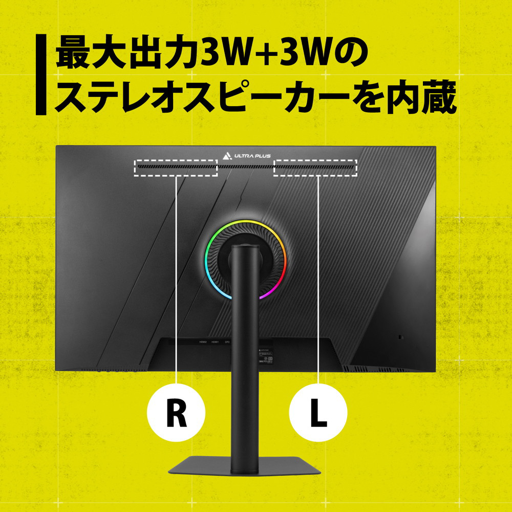 最大出力3W+3Wのステレオスピーカーを内蔵。薄型ディスプレイでありながらダイナミックなオーディオ出力でゲームや映画の迫力あるサウンドを楽しめます。