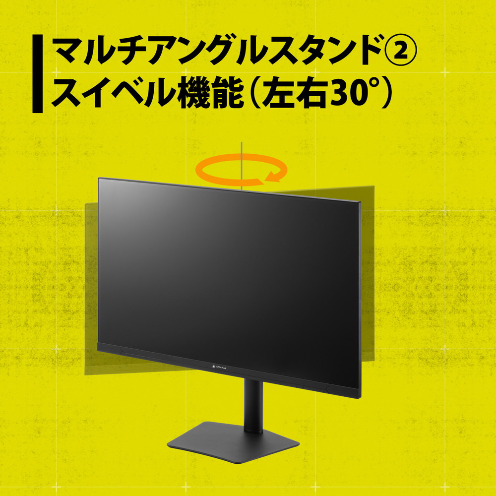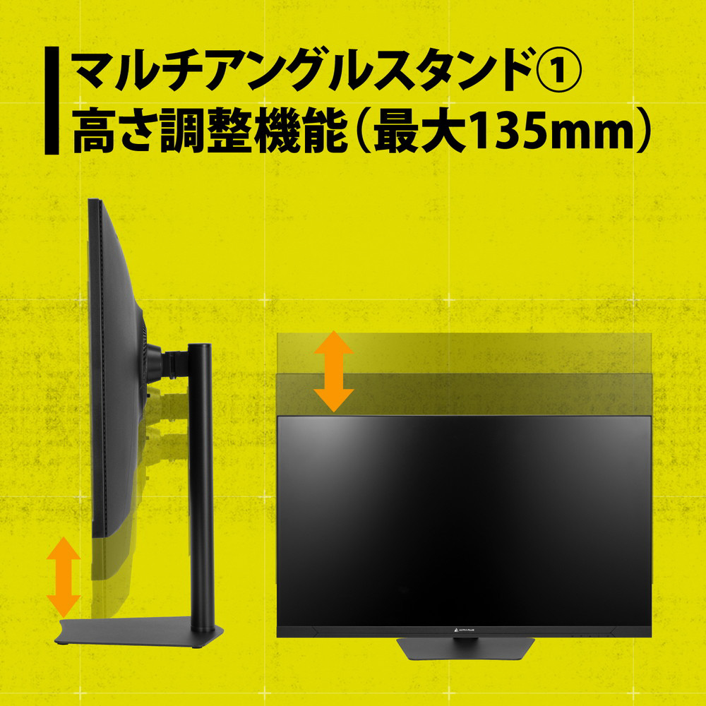 付属スタンドは最大135mm範囲の高さ調整が可能。左右30度のスイーベル調整と合わせてお好みの位置へセッティングすることができます。