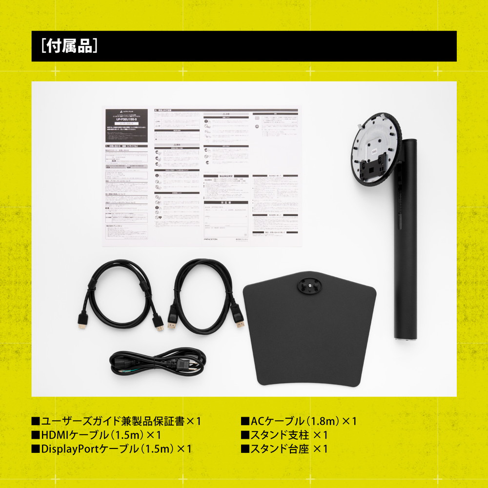 | 付属品 | ユーザーズガイド(製品保証書含む) x1 HDMIケーブル (1.5m) x1 DisplayPortケーブル (1.5m) x1 電源ケーブル (1.8m) x1 スタンド支柱 x1 スタンド台座 x1 |