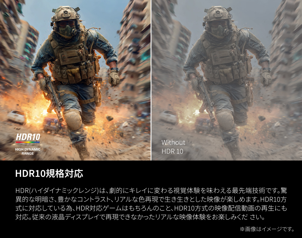 そして、HDRエフェクトモード(HDR10)を用いて、あらゆる映像をHDRの様な美しい映像に再現することができる為、HDR対応ゲームはもちろんのこと、HDR10方式の映像配信動画の再生にも対応。