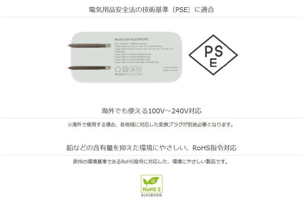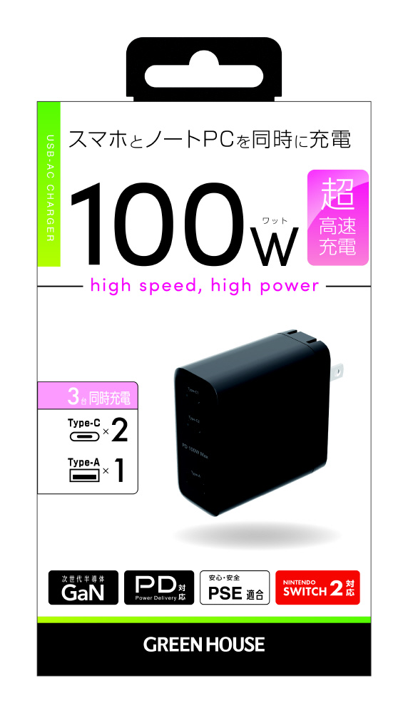 AC-USB充電器 ノートパソコン・タブレットPC対応 100W [3ポート:USB-Cx2+USB-A /USB Power Delivery対応] ブラック GH-ACU3PD-BK