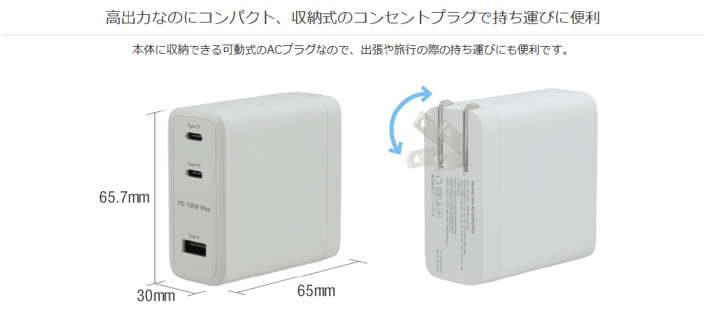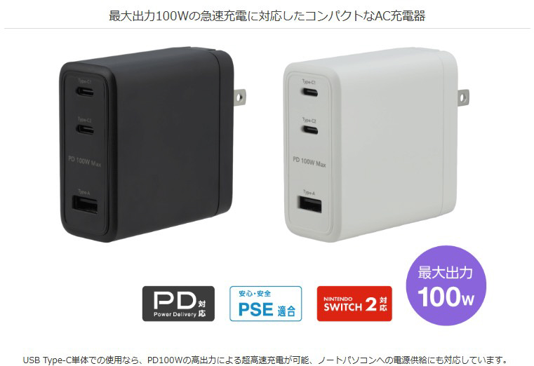 最大出力100Wの急速充電に対応したコンパクトなAC充電器