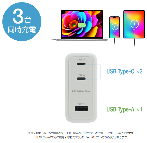 ※高速充電・高出力の給電には、別途、機器の出力に対応した充電ケーブルが必要になります。