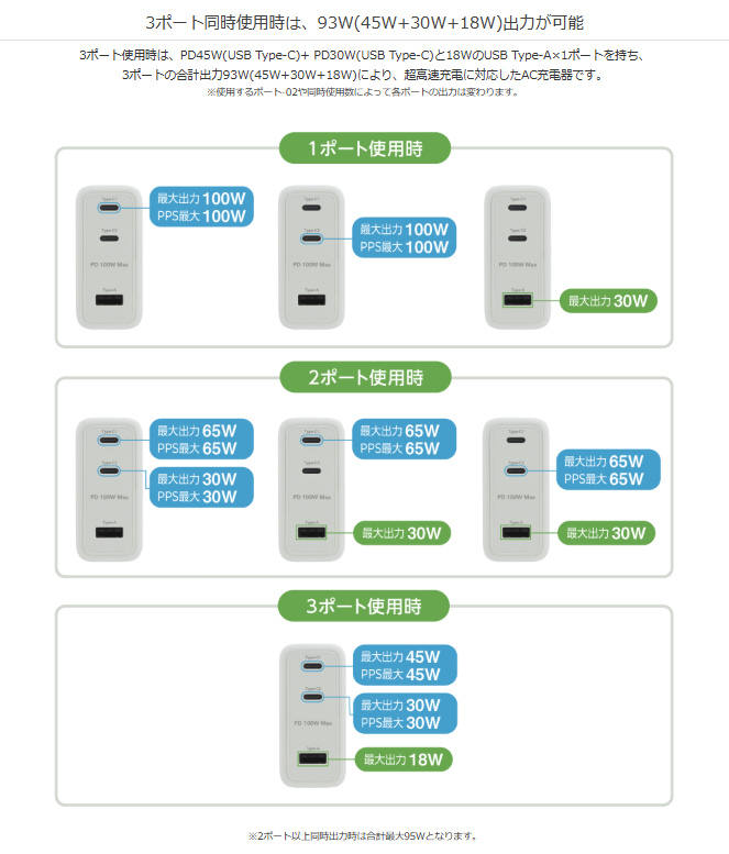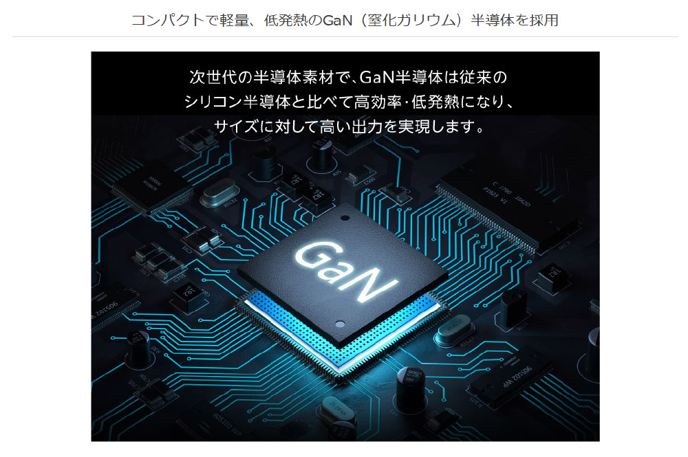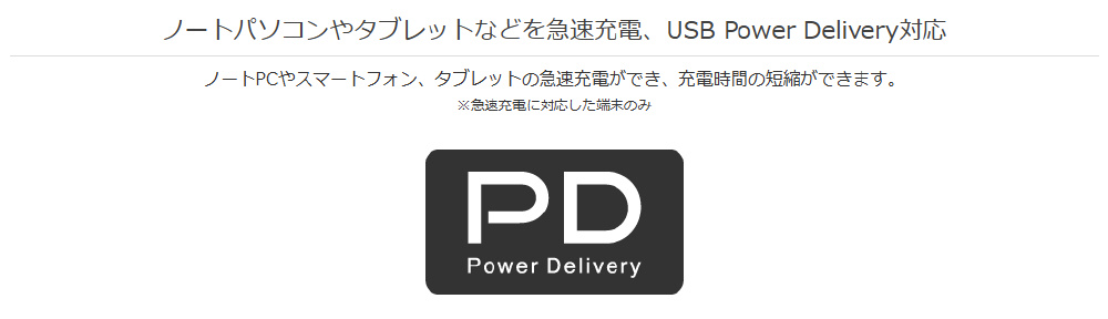 USB Type-C単体での使用なら、PD100Wの高出力による超高速充電が可能、ノートパソコンへの電源供給にも対応しています。