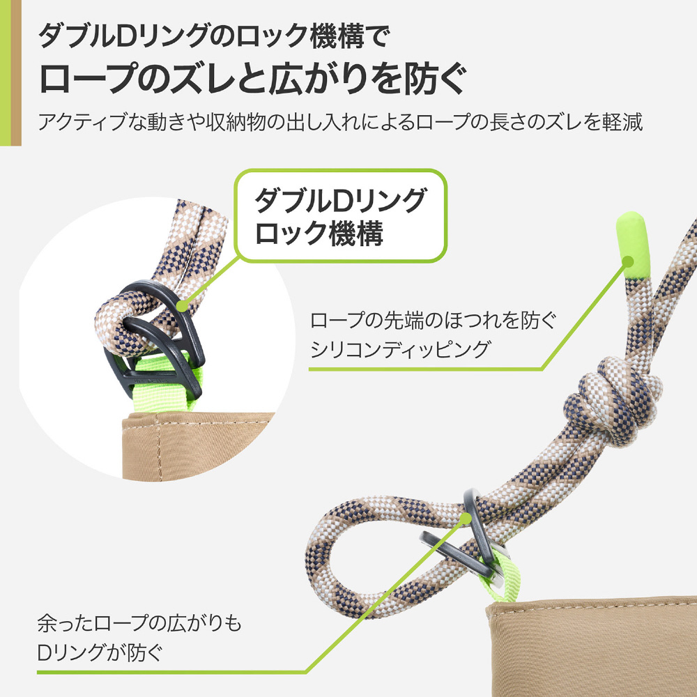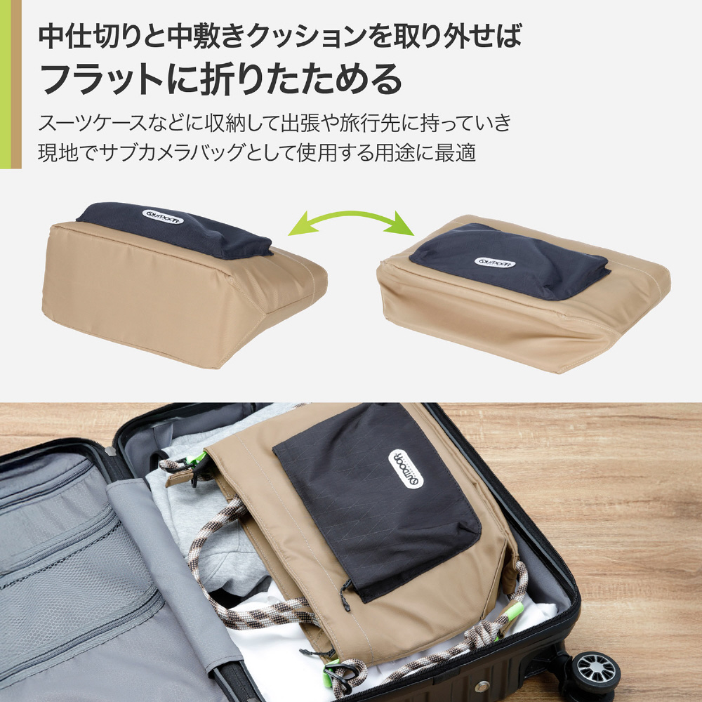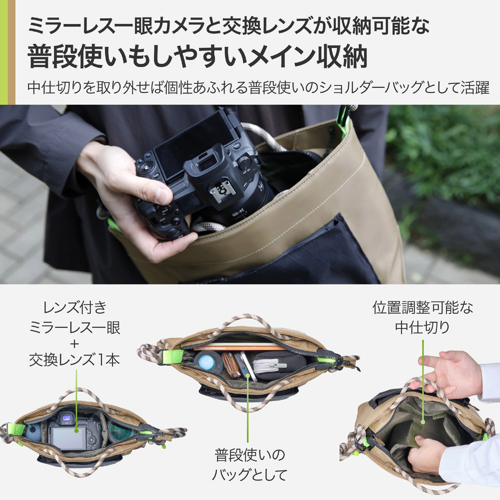 ミラーレス一眼カメラと交換レンズをしっかり収納できる機能性を持ちながら、ロープ状のショルダーストラップと、ビビッドなアクセントカラーを散りばめた遊び心あふれるデザインが魅力です。