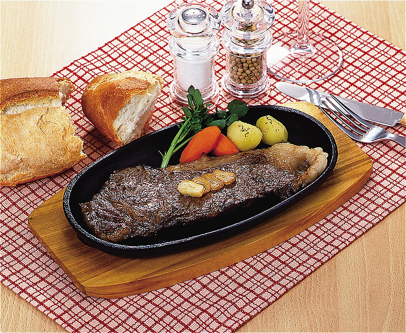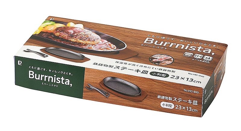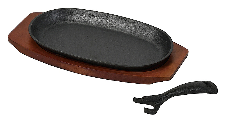 ●材質:ステーキ皿・ハンドル=鉄鋳物(表面油焼き加工)、木製プレート=天然木 (ポリエステル塗装)