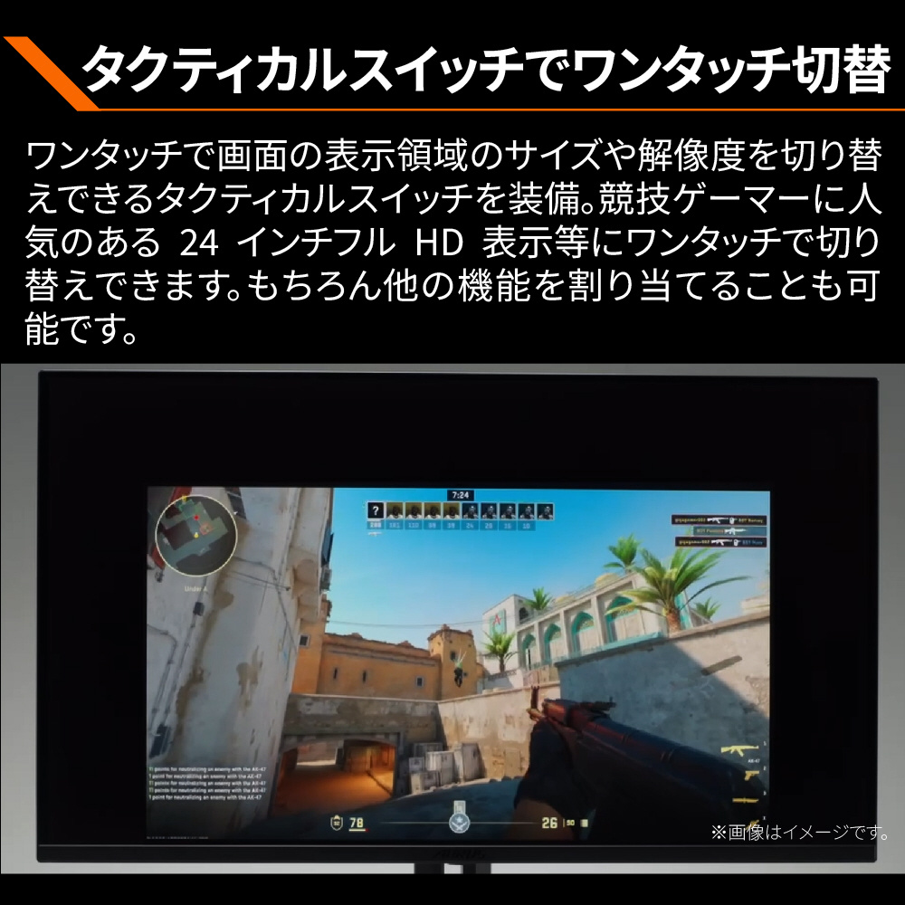 専用のスイッチには、特定のゲームのニーズに合わせて24インチ解像度に素早く切り替える、解像度切り替えなどのオプションを設定することができます。