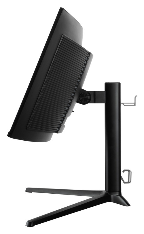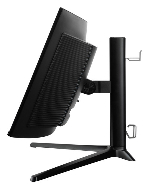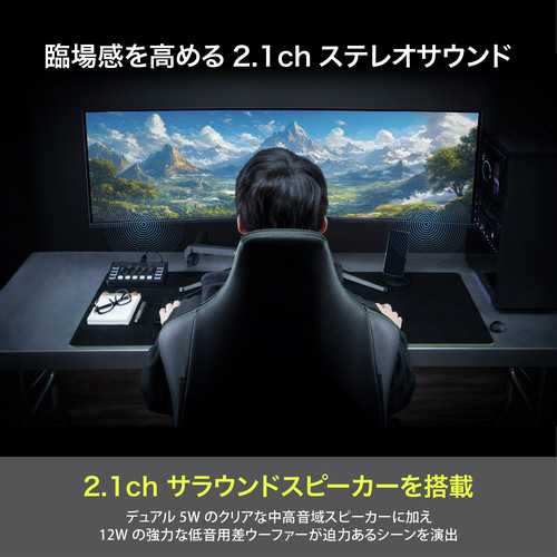 筐体内に、中高音域をクリアに届ける5Wスピーカー2基と、厚みのある低音を担当する12Wサブウーファーを内蔵しました。一般的なモニター内蔵スピーカーと比較し、迫力ある音圧と音域の広さを実現しており、別途オーディオ機器を用意することなく、これ一台でリッチなゲームサウンド環境が完成します。